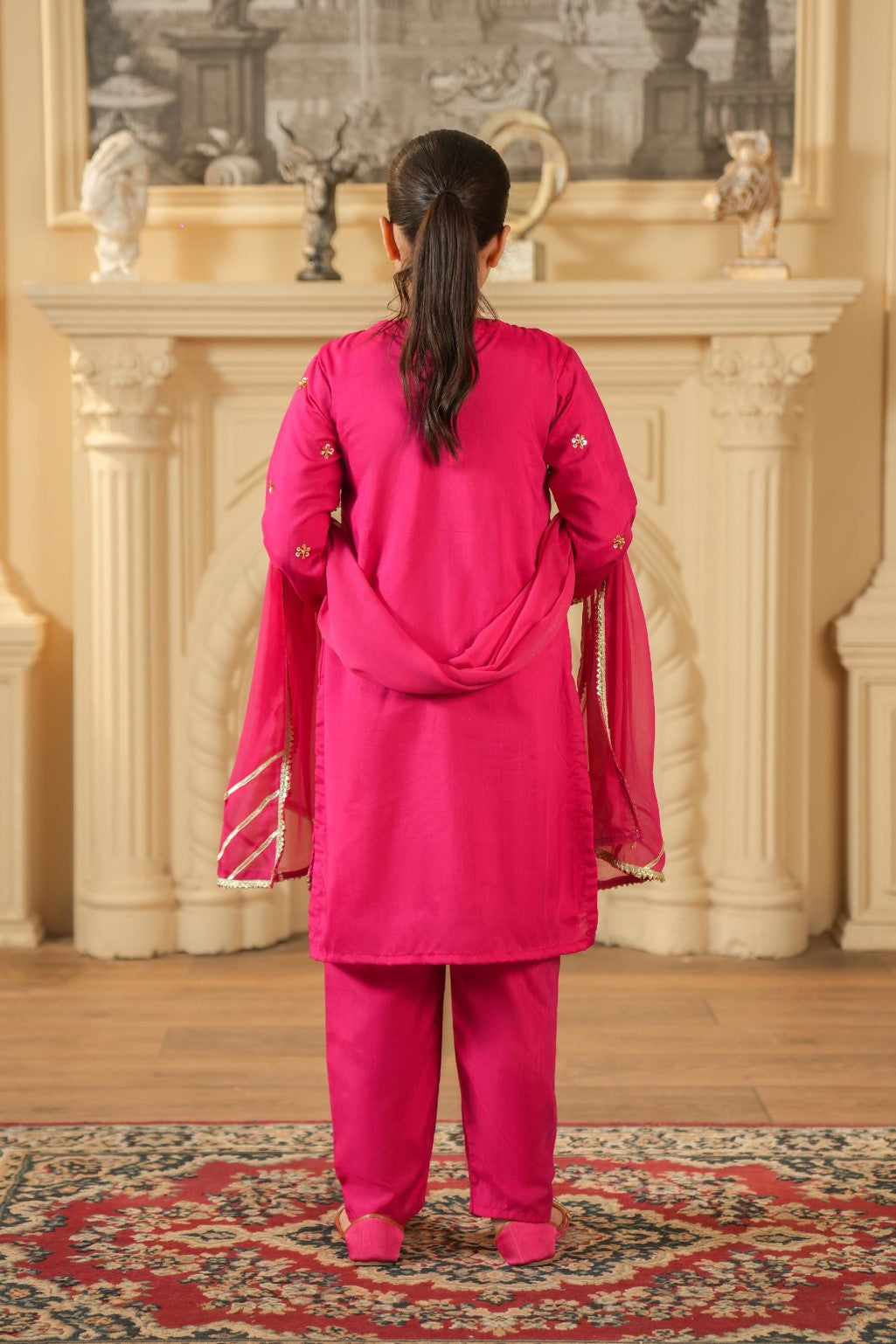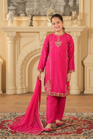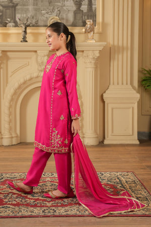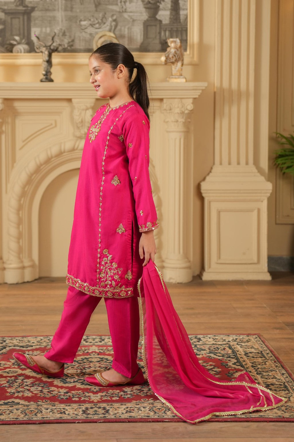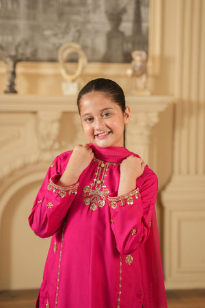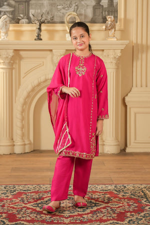 Elegant eastern wear girls 3-piece outfit in hot pink, featuring a Premium Rao silk embroidered shirt with embellished detailing, rao silk trouser, and a matching chiffon dupatta with golden accents. Perfect for festive and special occasions.