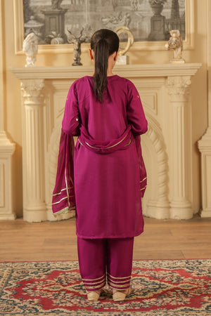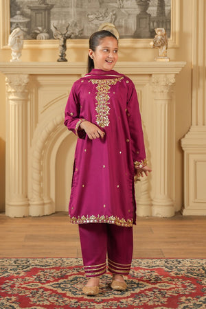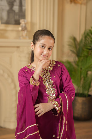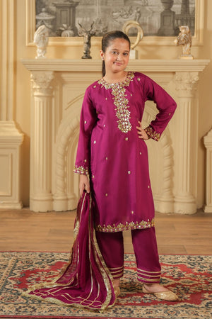 Dress your little one in elegance with this girls’ ethnic suit set,crafted in a rich deep magenta shade. The outfit is made from premium rao silk blend fabric, offering a smooth texture and a comfortable fit.