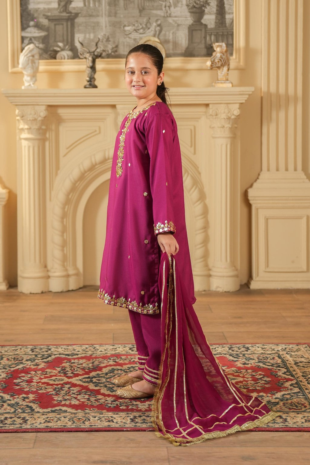 The shirt features exquisite hand-embellished zari and goota work along the neckline, hemline, and sleeve cuffs, adding festive charm and a touch of sparkle. The set is paired with matching straight pants accented with golden lace detailing and a lightweight dupatta edged with golden borders for a graceful finish.Si