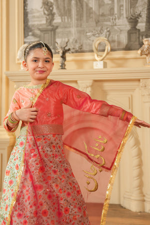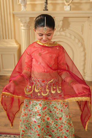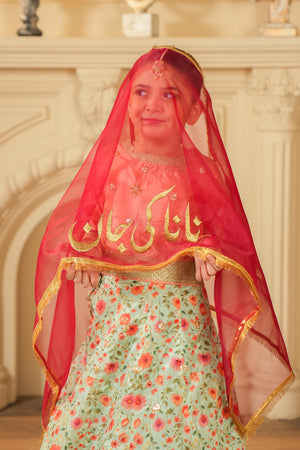 This festive organza dupatta features golden embroidery with “نانا کی جان” along the edge. Lightweight, soft, and stylish, it’s perfect for kids to wear at weddings, mehndi, and dholki functions.