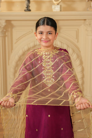 This net dupatta features delicate diagonal golden embroidery and a finely embellished border. Lightweight and festive, it’s perfect for weddings, mehndi, and family celebrations.