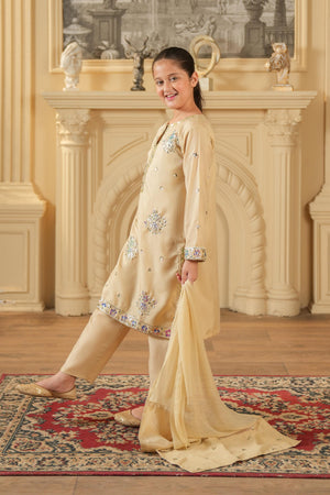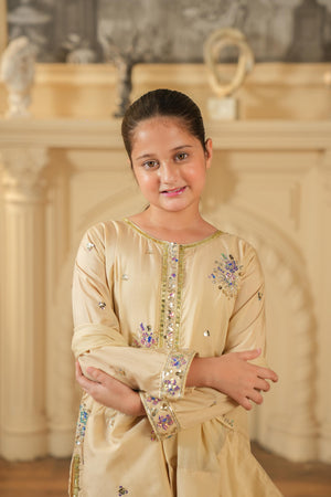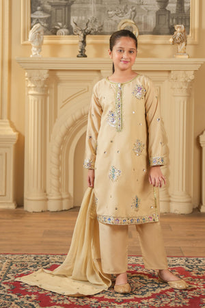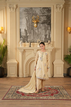 This soft beige 3-piece Rao silk suit features delicate embroidery and a matching chiffon dupatta with an embroidered border — perfect for festive and family occasions.