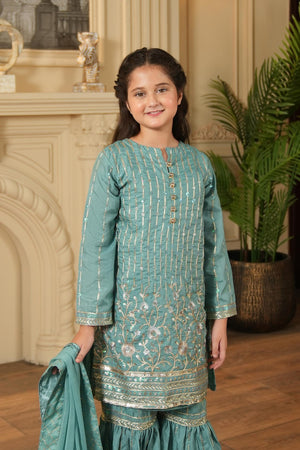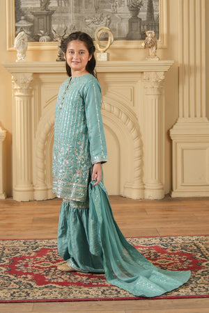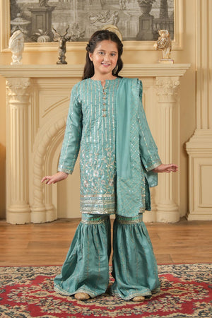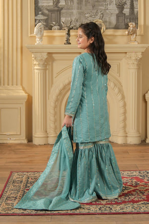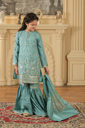 This teal green 3-piece set features a Rao silk embroidered kurta, matching gharara pants, and a chiffon dupatta with an embroidered border — perfect for weddings and festive occasions.