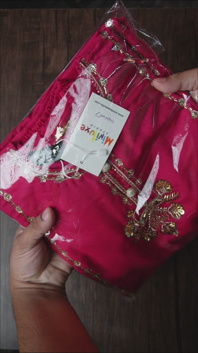 This vibrant hot pink 3-piece outfit is perfect for festive occasions. The Rao silk shirt features pretty embroidery and embellishments, paired with matching trousers and a soft chiffon dupatta with golden accents for a complete festive look.