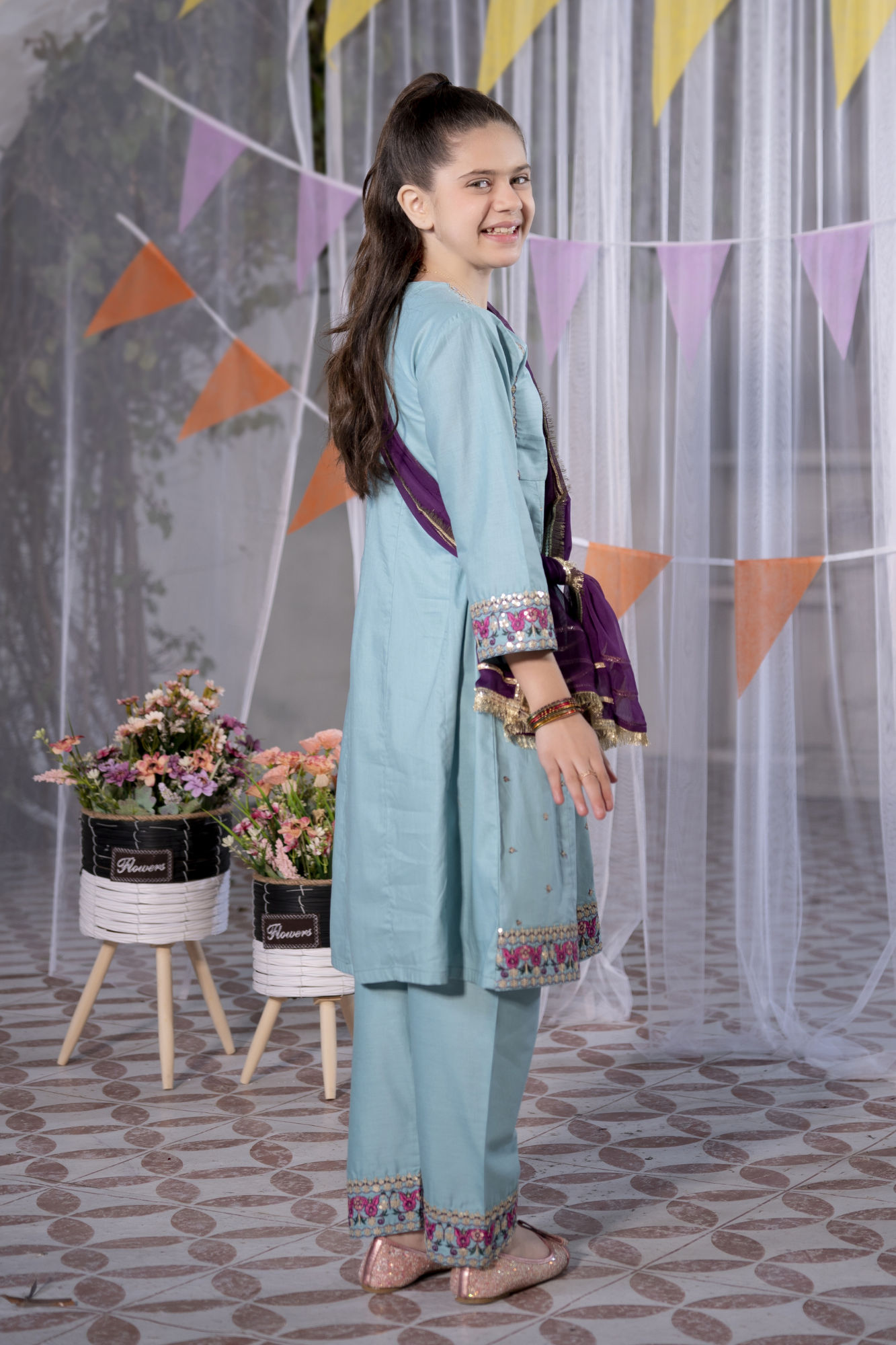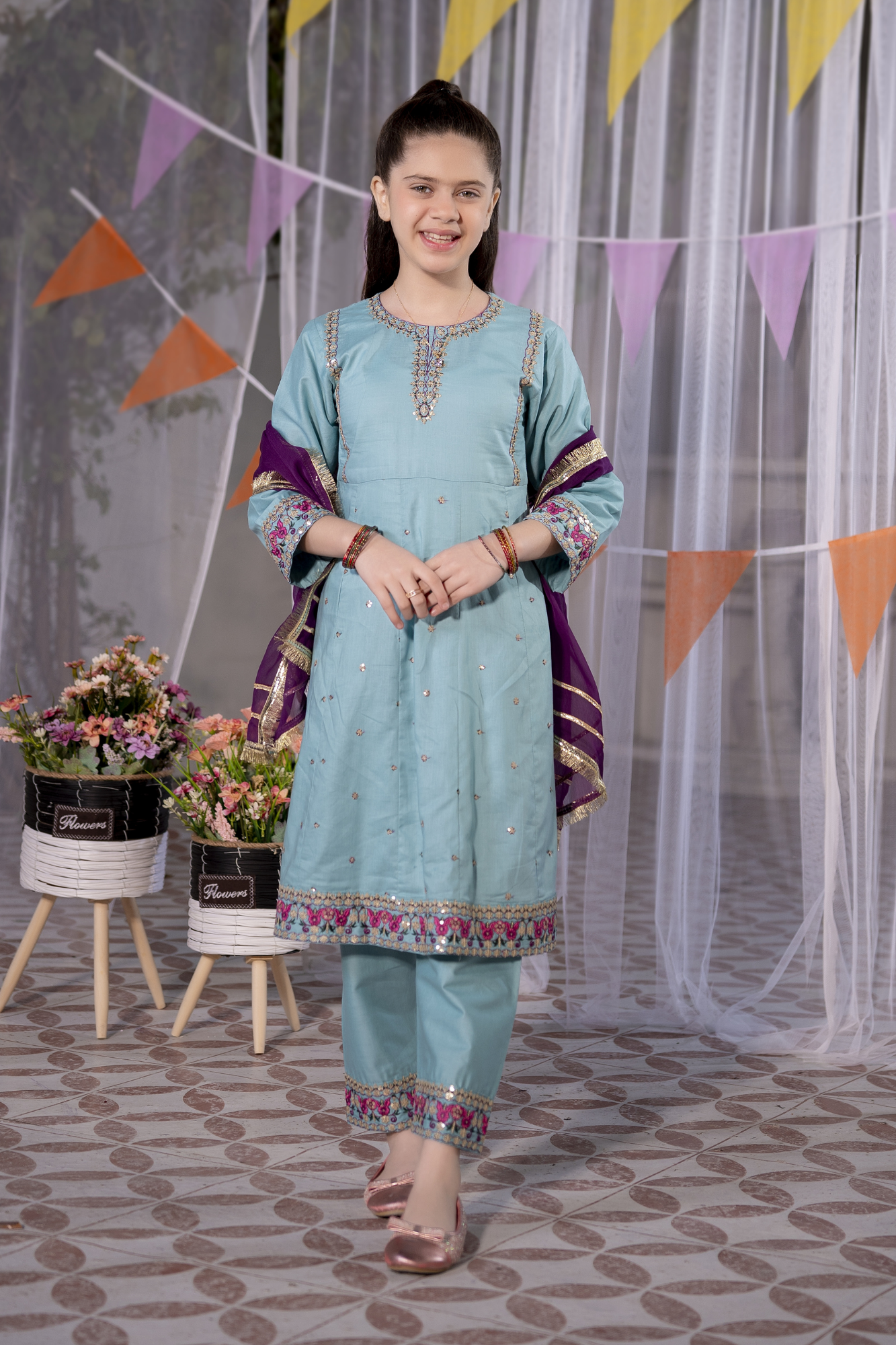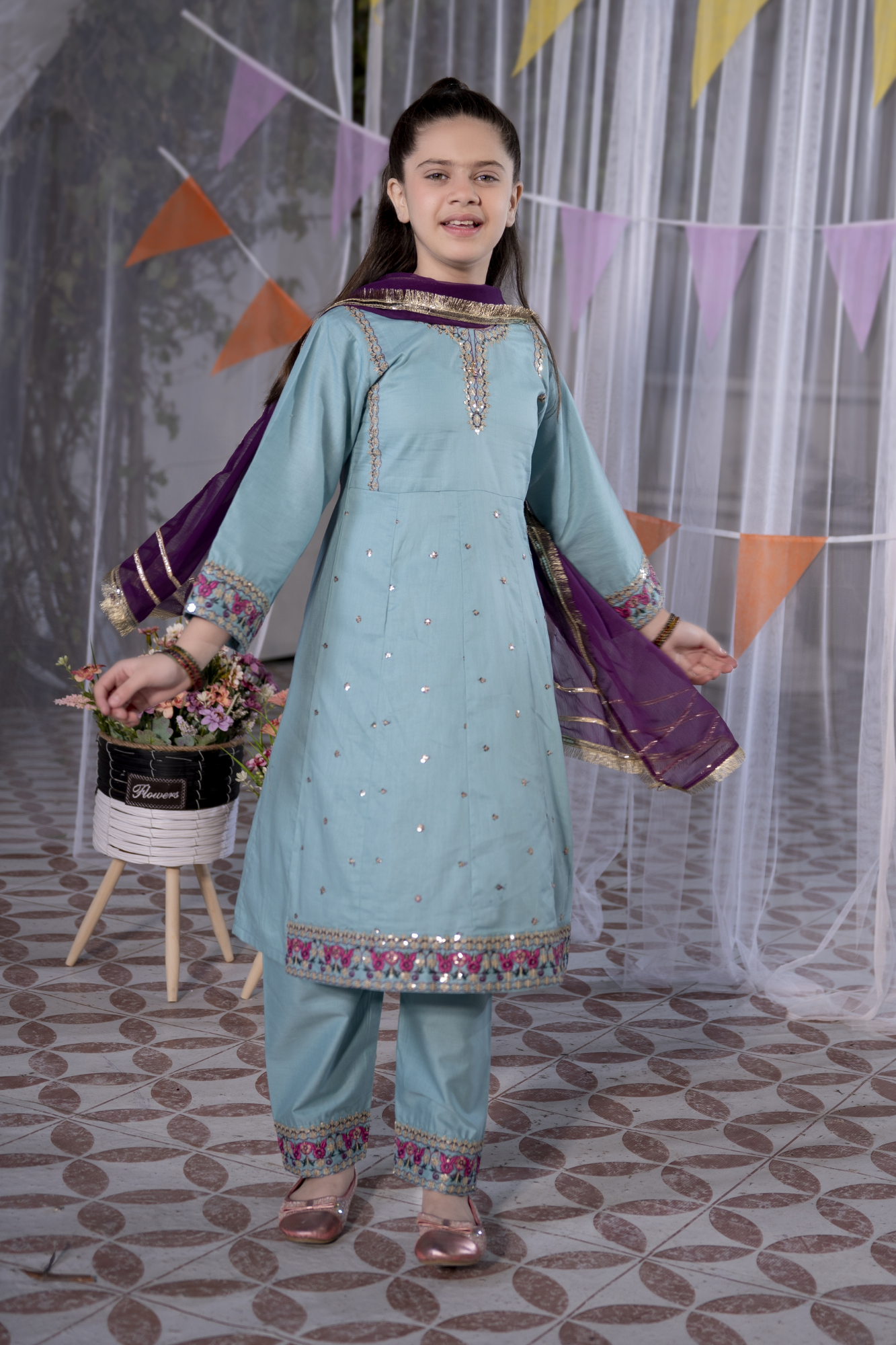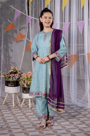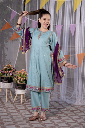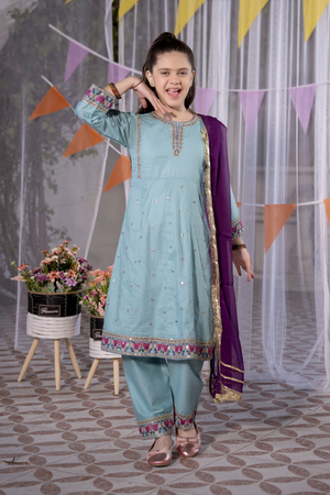 Add a touch of festive elegance to your little one’s wardrobe with this beautifully designed girls’ 3-piece eastern wear set by Miniluxe Studio. Styled in a refreshing aqua blue shade with delicate embroidery and subtle sequins detailing.