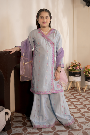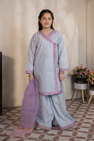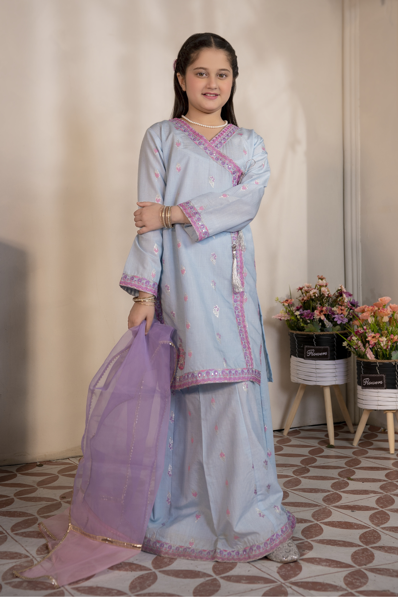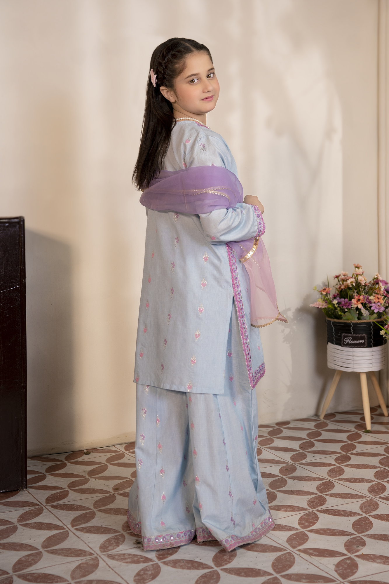 Bring home timeless charm and festive elegance with this beautifully crafted girls’ 3-piece eastern wear set by Miniluxe Studio. Designed in a soothing powder blue shade with delicate lilac accents, this outfit features fine embroidery and subtle embroidered motifs that create a soft, graceful, and festive appeal.