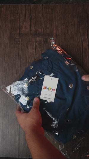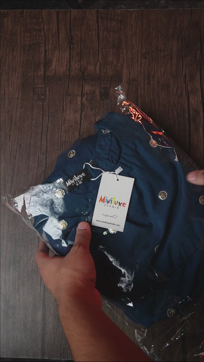 • Top (Shirt): Zinc blue jacquard shirt with twin sequin embroidery and floral detailing.