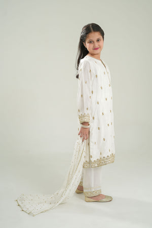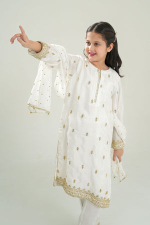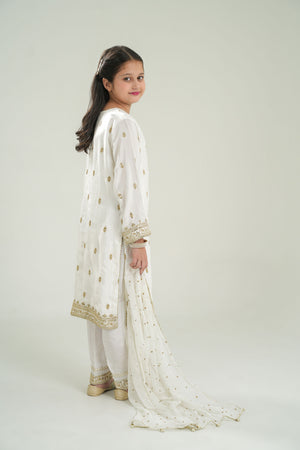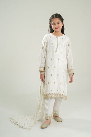 An elegant 3-piece outfit designed for festive occasions and family celebrations. The embroidered premium Rao silk shirt features delicate detailing and a soft sheen for a luxurious look. It is paired with plain premium Rao silk trousers for a clean and graceful finish. The ensemble is completed with an embroidered chiffon booti dupatta trimmed with lace, adding a refined touch of charm. Perfect for weddings, Eid, or cultural events, this outfit blends sophistication with comfort.