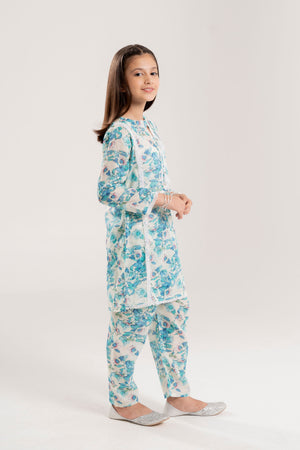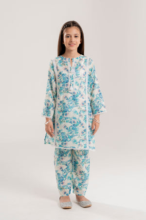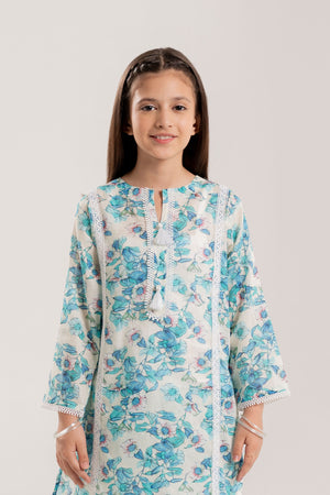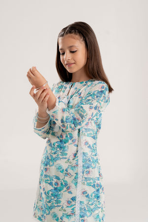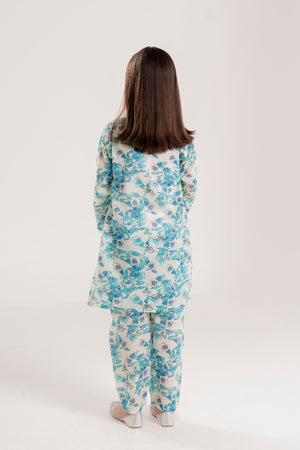 Add a refreshing touch to your little one’s festive collection with this beautiful aqua blossom kurta set. Made from a soft, breathable cotton blend, the outfit features an all-over floral print in soothing aqua and turquoise tones. The straight-cut kurta is styled with lace detailing along the neckline, cuffs, and hem for a graceful finish, and paired with matching trousers for a coordinated look. Perfect for Eid, summer gatherings, or casual family occasions.