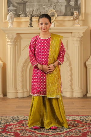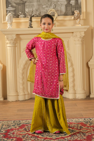 This vibrant pink chiffon shirt is paired with a lorus green sharara, featuring golden embroidery for a festive touch. Comes with a soft organza dupatta — perfect for weddings, mehndi, and celebrations.